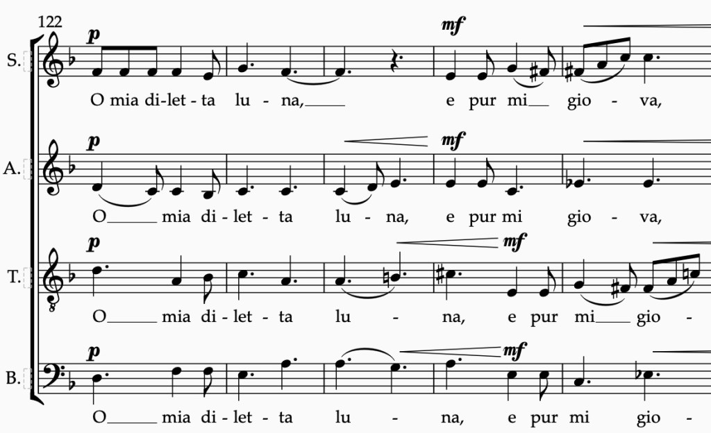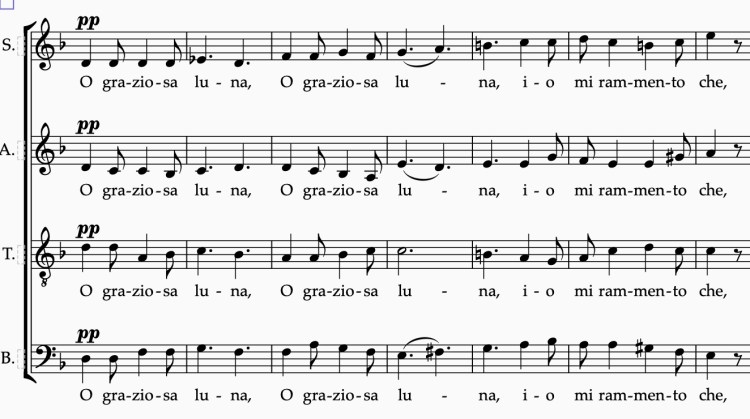 In vers 1, vers 6 en vers 10-11 wordt de maan op verschillende manier benaderd. In vers 1 wordt de maan namelijk gekwalificeerd met het bijvoeglijk naamwoord «graziosa», dat ook moet worden begrepen als «lieflijk» en «beminnelijk». Verderop echter (in v. 10) wordt de maan beschreven als «diletta» («geliefde»). De melodie ligt daar ook een terts hoger. Daartussen (in v. 6) ziet de dichter, een jaar na de 1e strofe, de maan door tranen en nevel. De melodie stijgt minder dan bij vers 1 en de 1e strofe wordt ook niet herhaald.