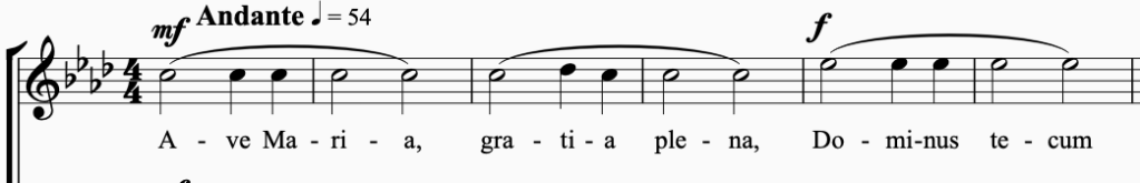 Ik heb gekozen voor een eenvoudige gedragen versie, waarin de verhevenheid en berusting van Maria doorklinkt. Dat komt tot uiting in een veelvukldig herhaald ritme lang-kort-kort-lang-lang.