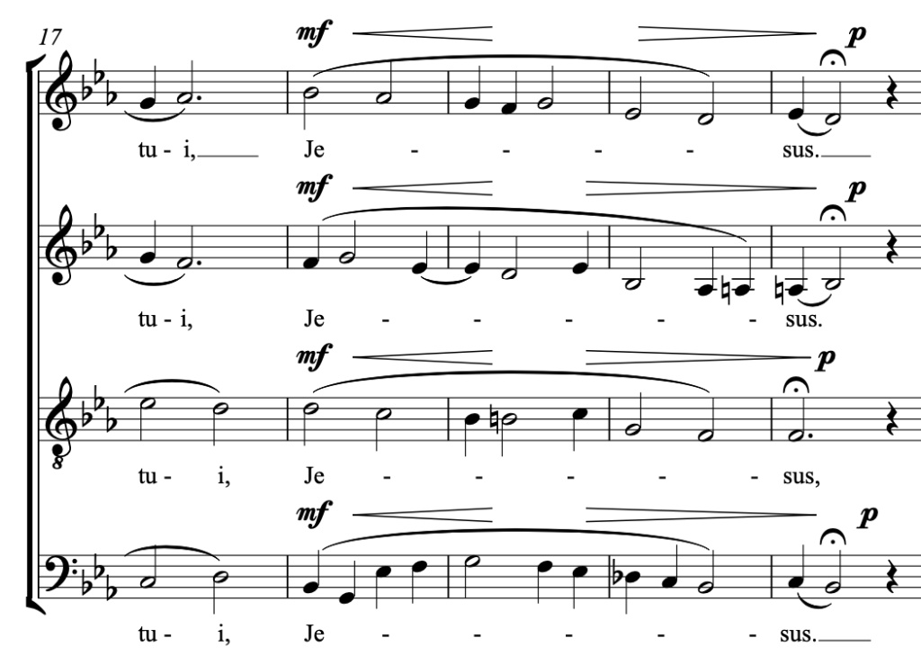 Het tweede gedeelte in Es-groot begint met eenzelfde 2 maten, maar waaiert dan melismatisch uit op “Jesus”. Het “Sancta Maria” heeft weer eenzelfde structuur als het eerste deel, maar staat nu in d-klein.