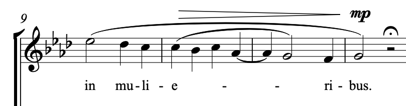 Het eerste homofone deel in f-klein bestaat uit viermaal 2 maten (bijna) identiek ritme, gevolgd door 4 maten afronding (op de tekst “in mulieribus”).