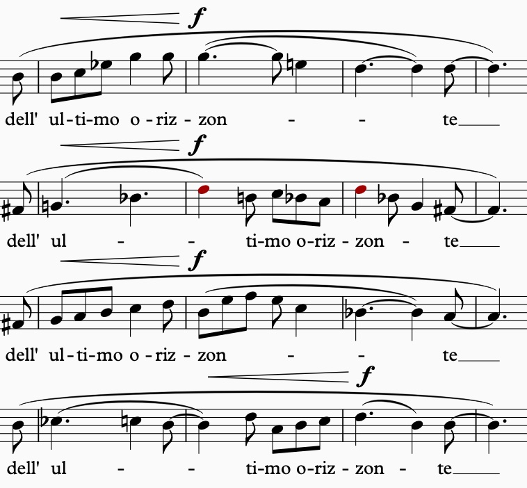 De wijdte van de horizon en de heuvel wordt uitgedrukt met de stijgende lijnen in alle stemmen en de hoge lange noten van de sopranen.