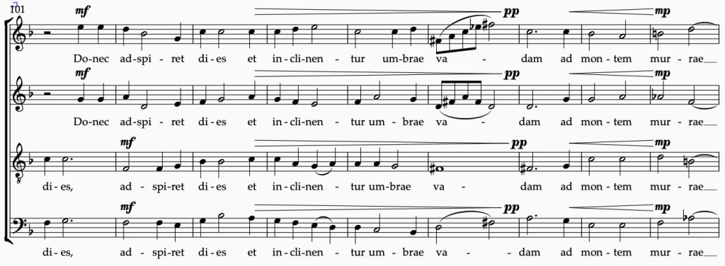 Bij het krieken van de dag en als de schaduwen vlieden zal ik gaan tot de mirreberg. Het beklimmen van de berg wordt aangeduid in de stijgende lijn op “vadam”.