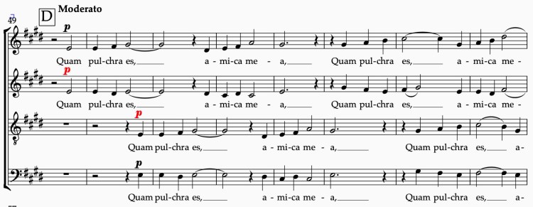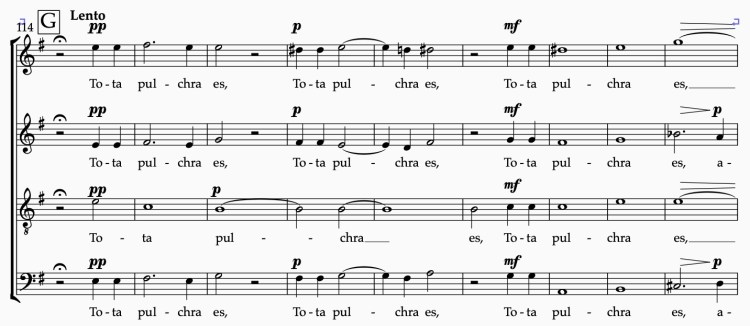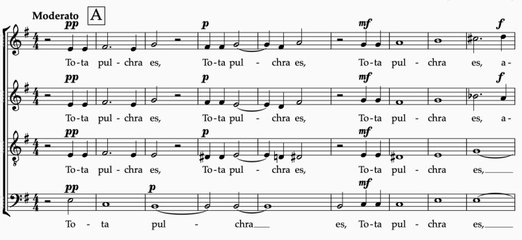 De kern, Tota pulchra es, wordt driemaal in stijgende lijn herhaald. Eerst met 3 stemmen eenstemmig op een liggende toon, oplopend naar 2- en 3-stemmig.